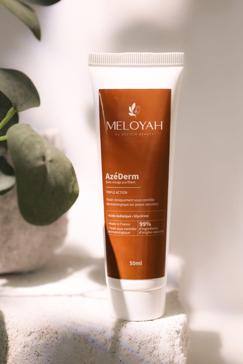 AzéDerm est une crème visage purifiante formulée pour les peaux noires, mates et mixtes sujettes à l’acné, aux pores dilatés et aux irrégularités du teint. Grâce à l’association de l’acide azélaïque et de la glycérine végétale, elle traite en douceur tout en hydratant la peau pendant 8 heures.